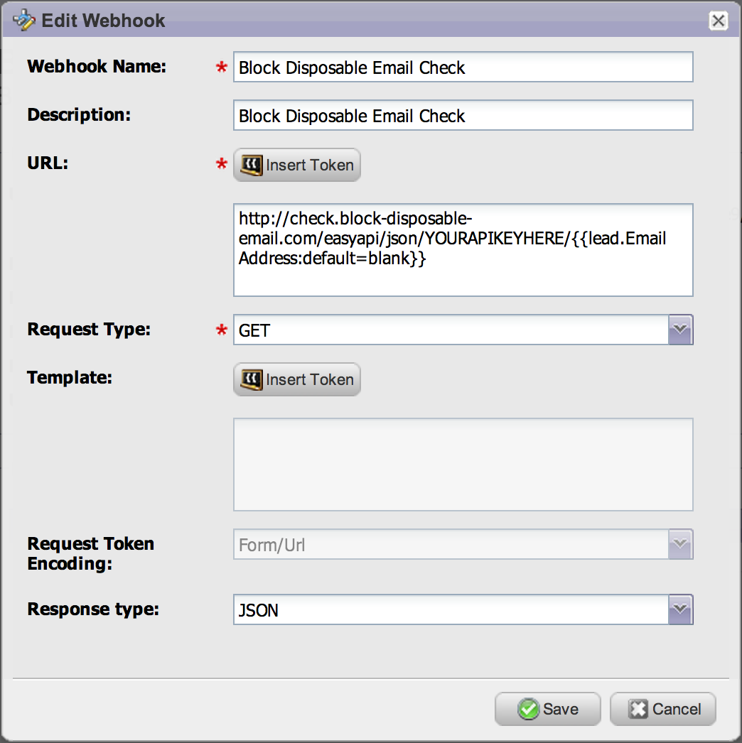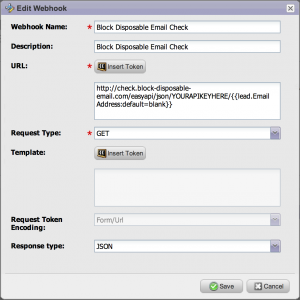 They use Marketo’s standard web hook and use Response Mapping to map domain_status to a field in Marketo.  Using the web hook as part of the Flow for a Campaign they check for the updated field prior to putting into a trial program.  If the response is “block” they divert them from their trial and send an email that basically says they would love to help you out, but please provide a real email.